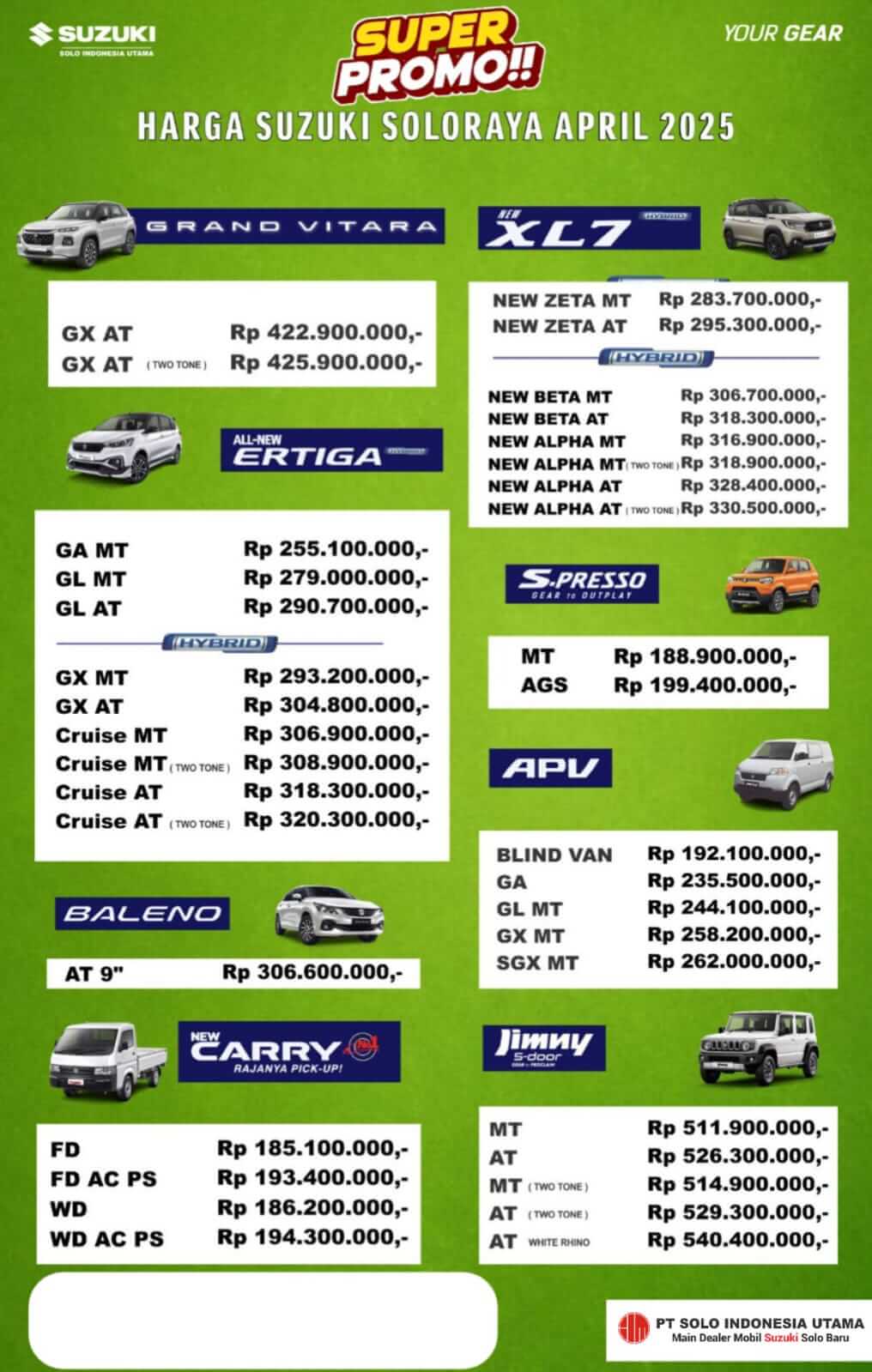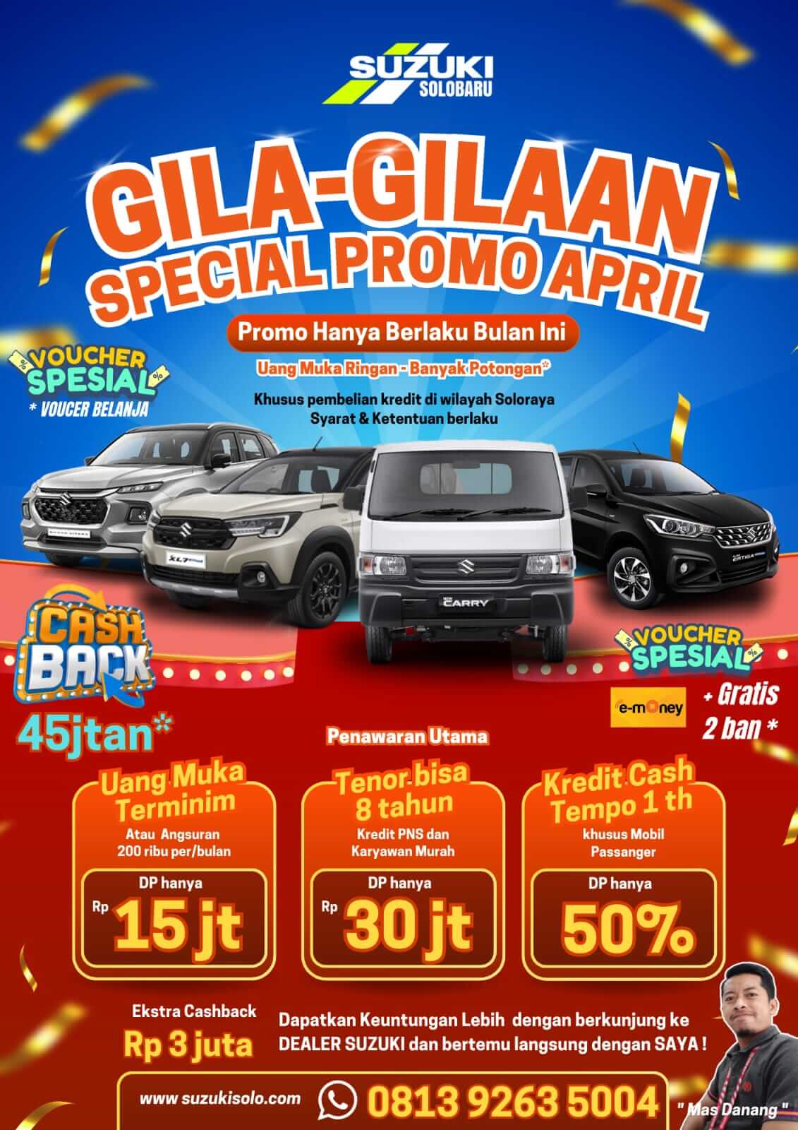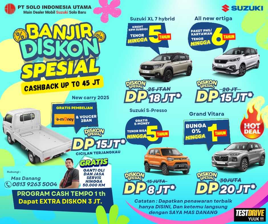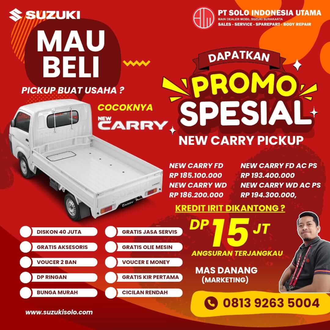 Dealer Resmi Mobil Suzuki Solo – Pusat Pembelian Mobil Baru Suzuki Untuk Wilayah Solo, Sragen, Klaten, Boyolali, Sukoharjo, Wonogiri Dan Sekitarnya. Info Promo, Harga OTR Terbaru Suzuki Solo, Proses Kredit Cepat, DP Murah, Angsuran Ringan, Diskon Menarik Lainnya. Langsung Hubungi Sales DANANG 0813-9263-5004 Untuk Info Pembelian Dan Booking Mobil Idaman Anda!PROMO SUZUKI SOLO BULAN INI